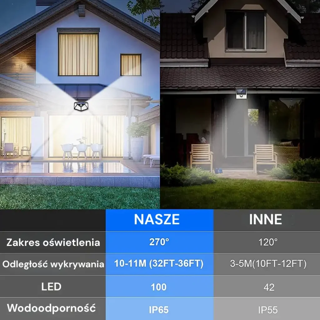 Zapewniają szeroki kąt świecenia 270°, idealny do dużych przestrzeni zewnętrznych. Dzięki światłu z 4 stron, mocniejszym diodom i ulepszonemu panelowi lampy są bardziej energooszczędne i jaśniejsze niż zwykłe.