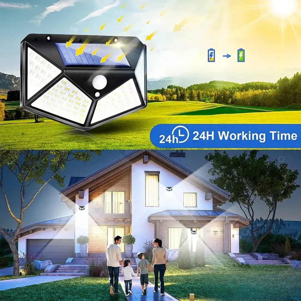 Ładuje się w ciągu dnia za pomocą ulepszonego panelu słonecznego i świeci do 12 godzin w nocy. Wyposażone w 100 jasnych diod LED i 600 lumenów, lampy gwarantują długotrwałe i mocne oświetlenie.